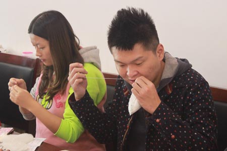 这种细致的针线活是很多准爸爸没有做过的事,今天的课堂上准爸爸亲自体验了一把穿针引线呢!看着他们,虽然动作上有些粗糙,甚至有点笨笨的,可耐心和满满的父爱是他们最好的老师,经过一番努力,成功的为准妈妈们分担了许多活儿,让妈妈们惊喜异常。