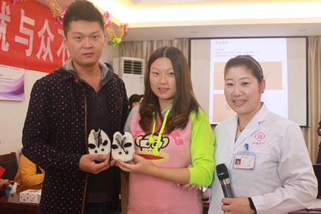 在当天的课堂上,国家二级心理咨询师、北京中科院心理研究所研究生、凤凰妇产医院客服部王国卿主任亲自在课堂上为准爸妈们讲授DIY熊宝宝婴儿鞋的一些小技巧,与准爸妈们一起动手制作了漂亮可爱的熊宝宝婴儿鞋。精致的布料、细细的线绳、圆润的珠子,经过孕妈们耐心、细心的加工改造,变成了一个个造型憨态可掬、色彩温馨的熊宝宝婴儿鞋。那一刻,一股美美的成就感溢满心头。