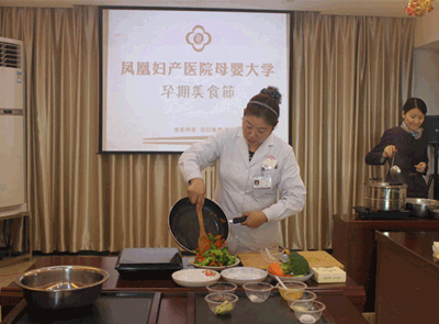 上午12点,凤凰妇产医院母婴大学孕期美食节正式开灶。王主任为准妈妈准备了海带炖鸡汤、西兰花炒胡萝卜两道简便、可口的孕期美食。