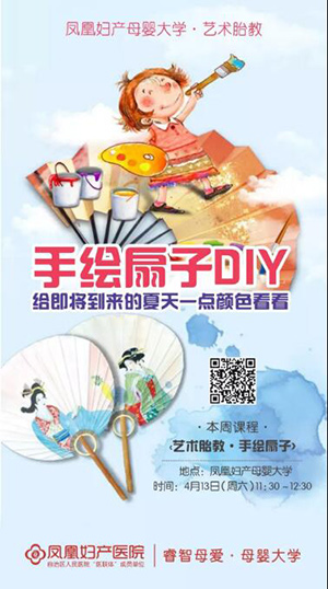 孕期手工DIY,不仅能打发无聊孕期,还能扫空孕期焦虑敏感的心情,让孕妈的心变得更加细腻安静,好心情的宝妈更容易生下健康可爱的宝宝!凤凰妇产·母婴大学为孕妈们准备了别有生趣的手绘扇子DIY,和老公、家人、宝宝一起亲手制作,有助于愉悦宝妈的孕期生活,调节孕期情绪,还能丰富胎教形式,让宝妈感受不一样的孕期生活~