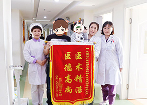 产妇家属和第一胎的凤凰宝宝将锦旗赠于凤凰妇产医院的医护们